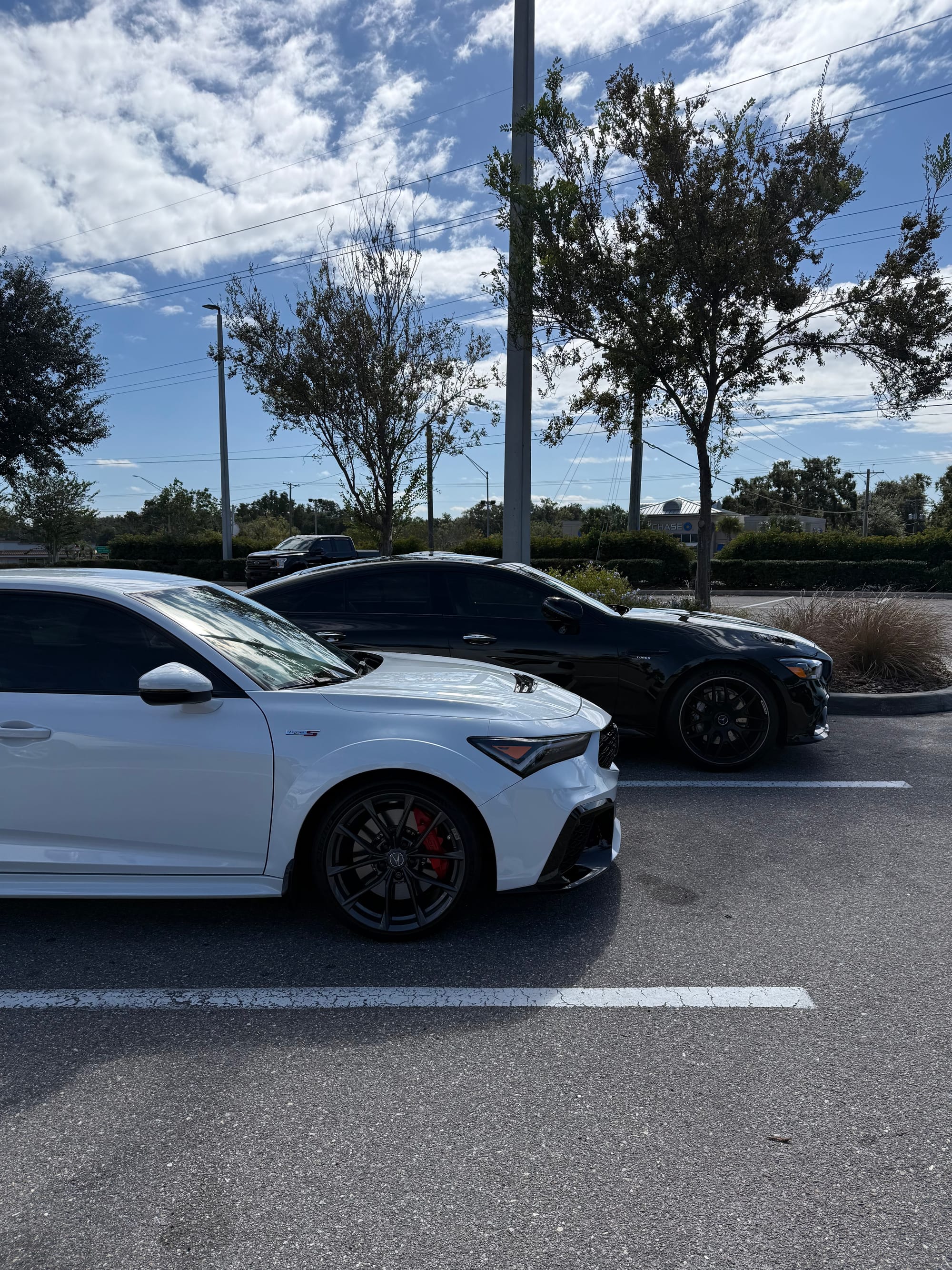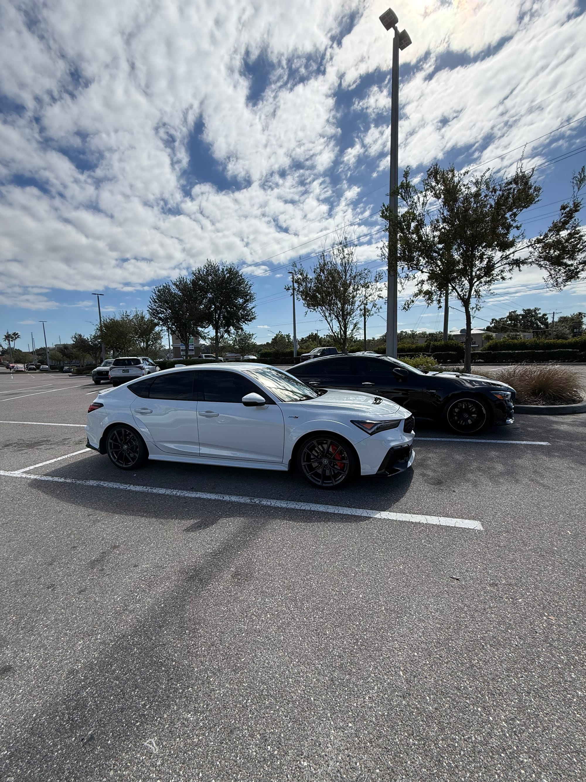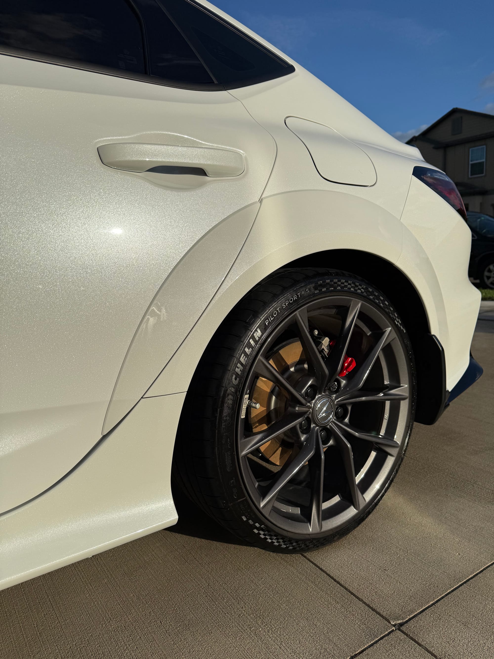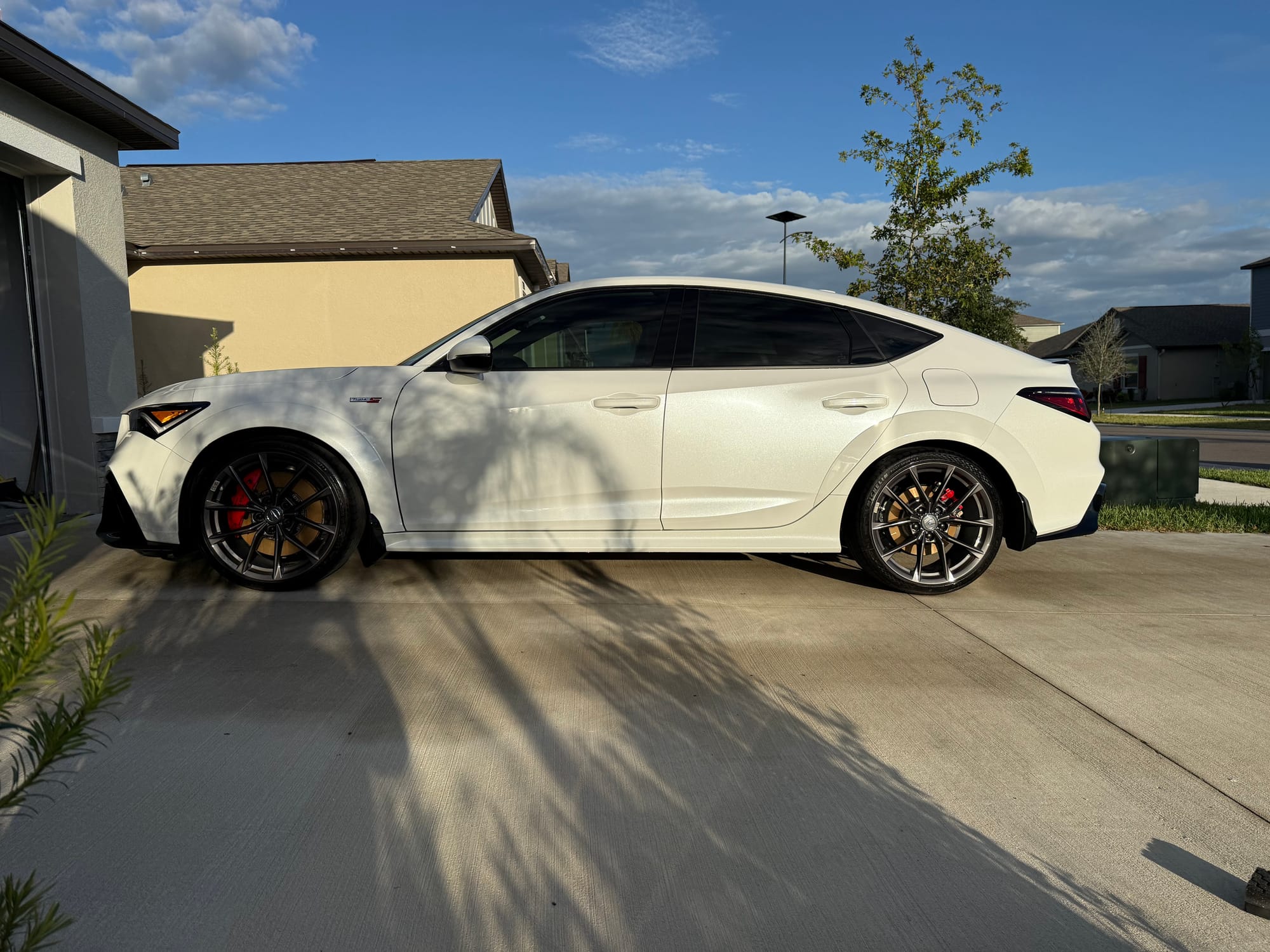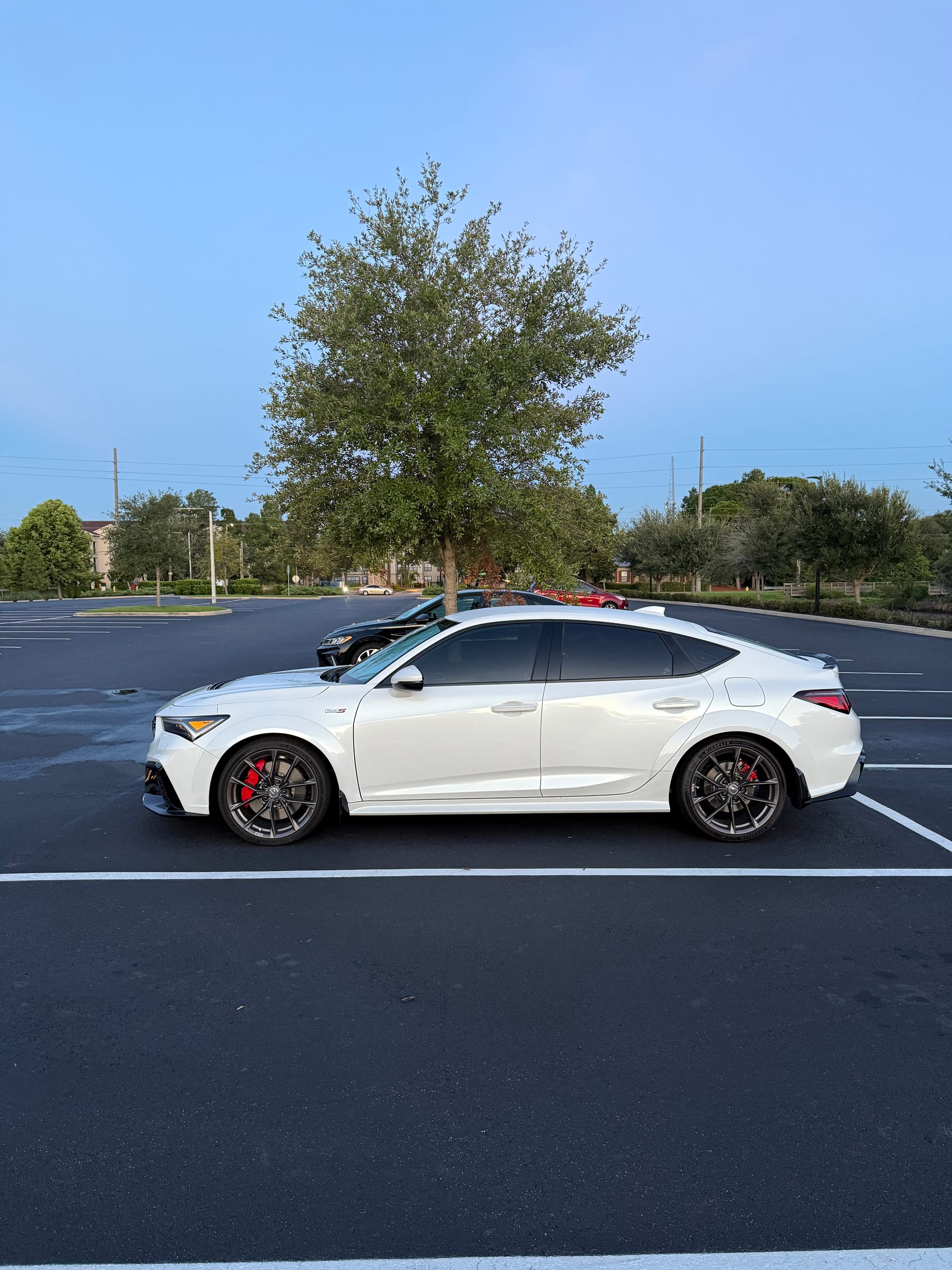 -This car is absolutely gorgeous. In todays age where cars are looking uglier, blockier, and less elegant the Type S breaks the mold. The curb appeal is amazing, the stance of the car with the widebody from the factory is second to none. There are front brake ducts hidden in the front bumper. There is canards hidden in the front side bumper panels for added stability when taking corners at speed. The hood vent actually lets heat out and is placed right near the turbo. Brembo brakes with "Acura" written on them in red matches the interior perfectly and adds to the racecar look without being childish. The front and rear have LED lights with the front being Jewl LEDs (idk what that really means but damn they are nice). The driving lights add to the mean front end and the black and white contrast seen from the front bumper to the back diffuser is properly thought out. Speaking of which, the back diffuser has massive fins and the cutout for the sizable triple outlet exhaust with exhaust valves. There is also a spoiler in black on the rear decklid and shark-fin antenna on the rear middle of the roof. My car has the dealer installed mudguards in black, which I think amplifies the stance and limits rock chips in addition to tinted windows, which only supports the black and white contrast. The rocker panels are also specific to the Type S as they have more curves than the base Integra. Also notable is how many places the Type S is written over the car. There is a badge in the front grill, on the rear bumper, on the front quarter panels, inside the car on the steering wheel, shifter plate trim, seat headrests, and front door sills. The wheels are lightweight and 265/30ZR19 fitted with Michelin Pilot Sport 4S summer sticky tires. This combo just adds to the "racecar" look and stance and almost gives the appearance that its lowered without actually being lowered.